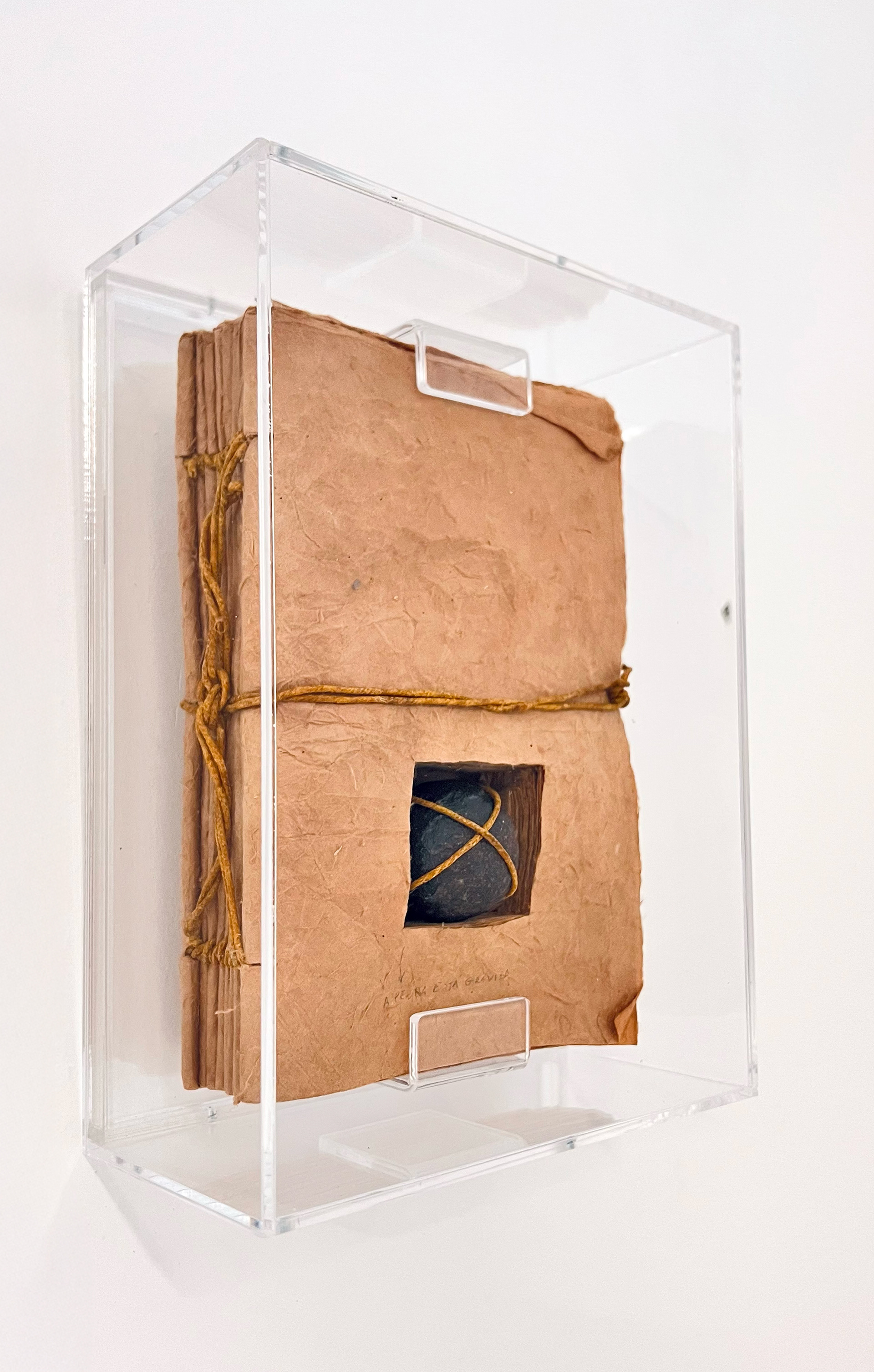 concretion stone with fossilized core, handmade binding with sheets soaked in black tea and waxed cord, acrylic box, A4 size